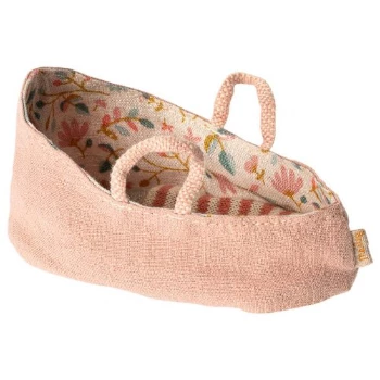 Your little Maileg friend can curl up under the striped blanket in this carrycot and take a short nap in this attractive carrier. The inside of the carrycot is decorated with a nice flower print and is easy to hold by its two handles.
