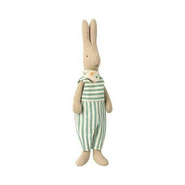 Height: 25 cm Material: Cotton /Polyester Washing Instruction: 30 C Age: 12+ months Adam the mini rabbit is ready to make new friends! He is dressed in his adorable blue stripped overall and a floral pattern bandana around his neck.