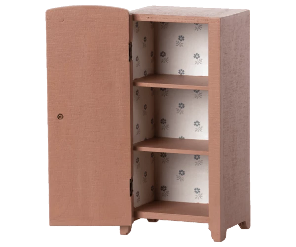 This vintage looking closet has a beautiful embossed flower print on the front and beautiful printed wallpaper inside. The shelves inside will make sure the organizing play will begin. This closet fits into the Maileg dollhouse Size: Mini Hight: 23 cm Width: 11 cm Age: 3 YR+ Wash: Surface wash Material: FSC Wood