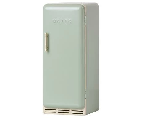 Una nevera antigua que se adapta perfectamente a la casa de muñecas en miniatura. La nevera está hecha de metal con cerradura magnética y estantes esmaltados en el interior. Una gran complemento para esta nevera es la caja de comestibles en miniatura.