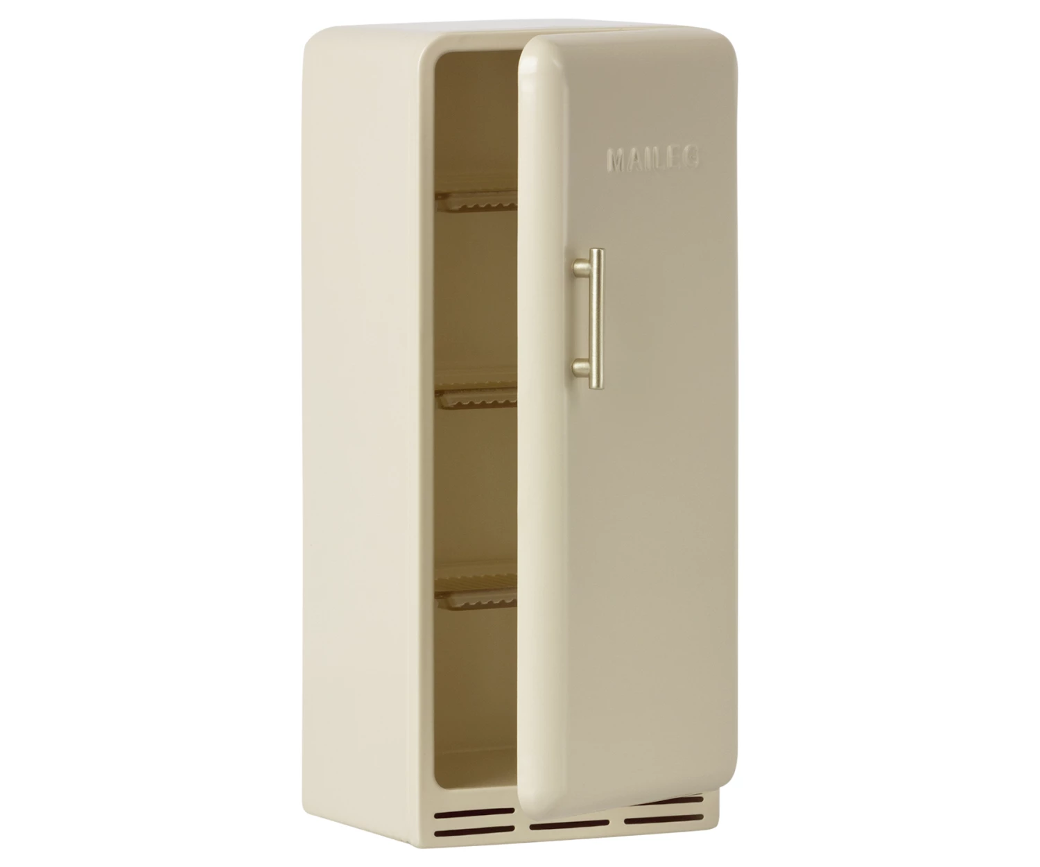 A vintage 1950s style fridge that is perfect for the little Maileg mice to reach into. The fridge is made in metal with a magnetic lock and frosted shelves inside. A great addition to your Maileg home accessories.