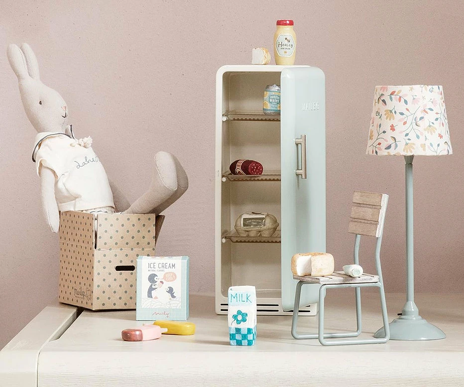All the food your Maileg friend could possibly need. This selection of food includes mayo, milk, honey jar, sausage, 4 ice cream sticks, egg carton, 2 soda cans and a cheese. It will be delivered in a cardboard box.