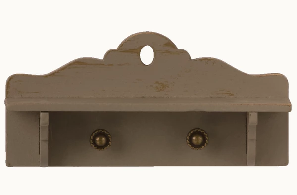 This little cute wooden shelf can be placed where ever you like in your Maileg Dolls house . In the bathroom hang your towel Hang up your apron in the kitchen Height: 4inches Width: 9inches Material: Wood Age: 3+.
