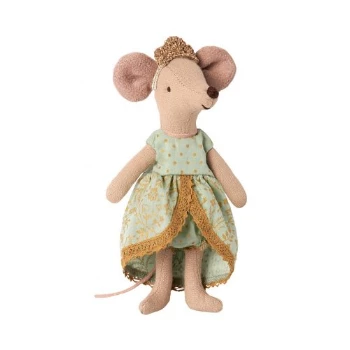 Make your friend Maileg feel like a princess in this cute outfit! This princess dress includes a mint dress with gold decorations and lace and a gold tiara. Fits all micro Maileg friends including bunnies and Big Sisters.