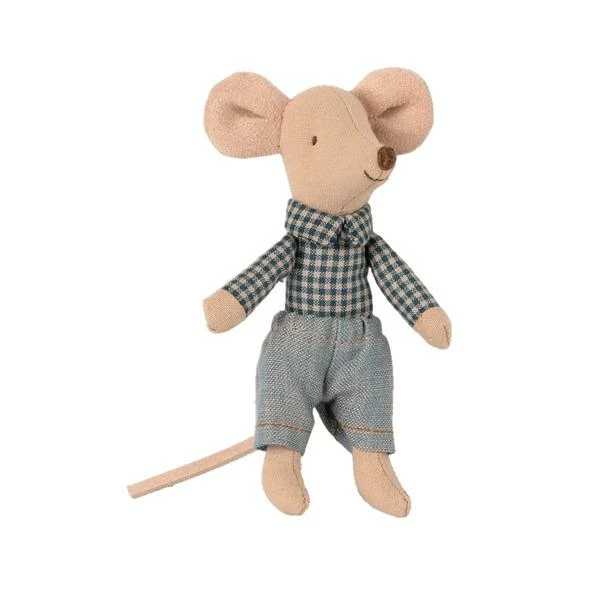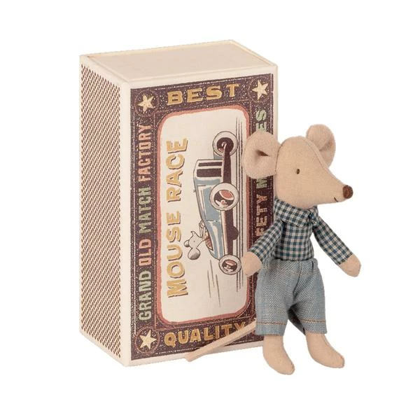 This little brother mouse by Maileg comes complete with his own sturdy cardboard matchbox home, a soft mattress, striped patterned hemmed blanket and a soft plump blue pillow. He is delightfully dressed with a gingham blue shirt and blue cotton trousers. With soft pink ears and an embroidered smile this happy little mouse in a matchbox is a gift that will be cherished forever. Mouse size 10 cm in height, suitable from 3 years and up, washable at 30 degrees.