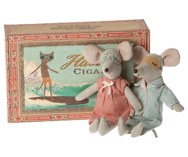 Mother/Father mouse Height:17 cm Recommended age:+3 Year Wash:30°C Material:Cotton/LinenFilling:Recycled polyester/Pe Pellets A classic Maileg item. Mom and Dad mice are wearing their beautiful nightwear and eye masks. The cigar box is a perfect bed for a good night’s sleep and sweet dreams.