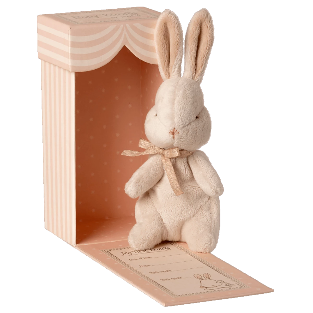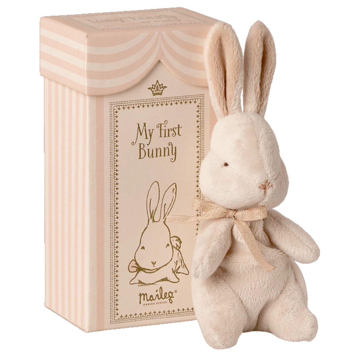 My first bunny is perfectly made for small hands. It is made in a soft plush quality and has a colored ribbon around the neck. It is packed in a beautiful gift box where you can add the birth information inside. This is the perfect baby shower gift.