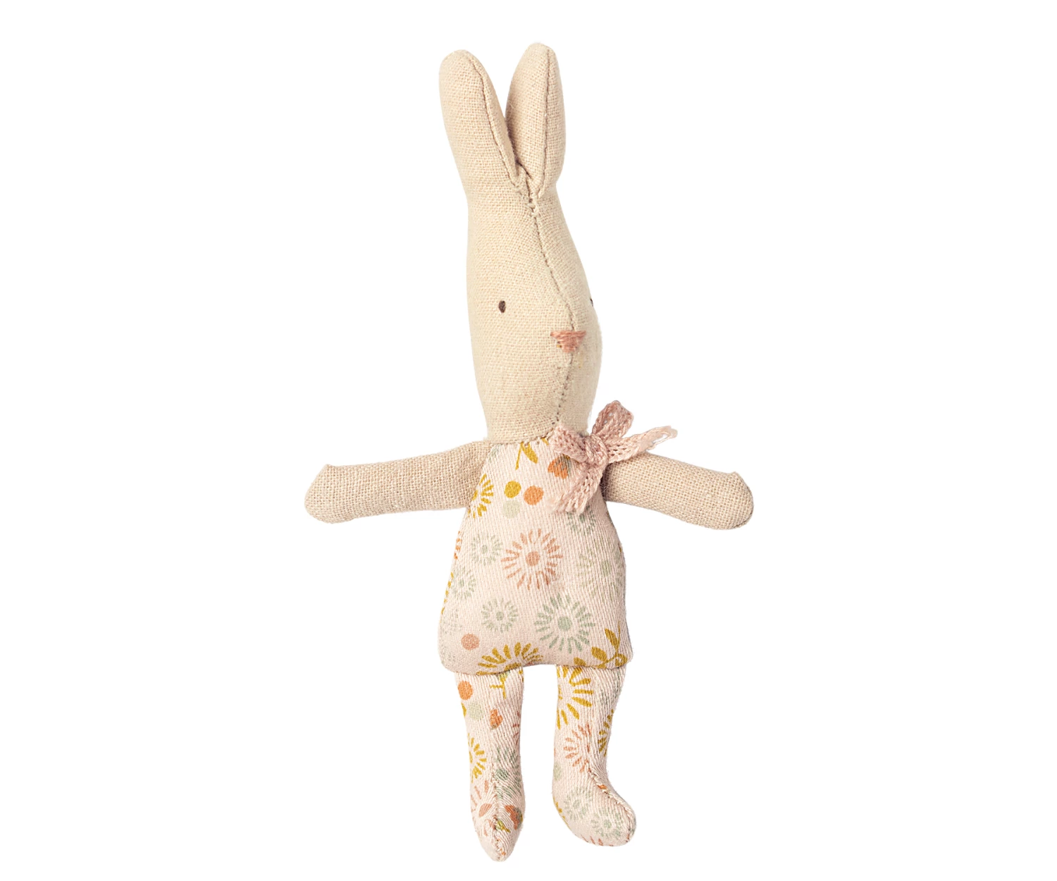 Introducing our teeny tiny size called My. My rabbits are the cutest size yet designed. This little rabbit is in the latest outfit design of the season – swirly printed fabric with a cute bow in pink. There is a whole range of furniture designed for them too including My sized prams, high chairs, carry cots and bouncing chairs.