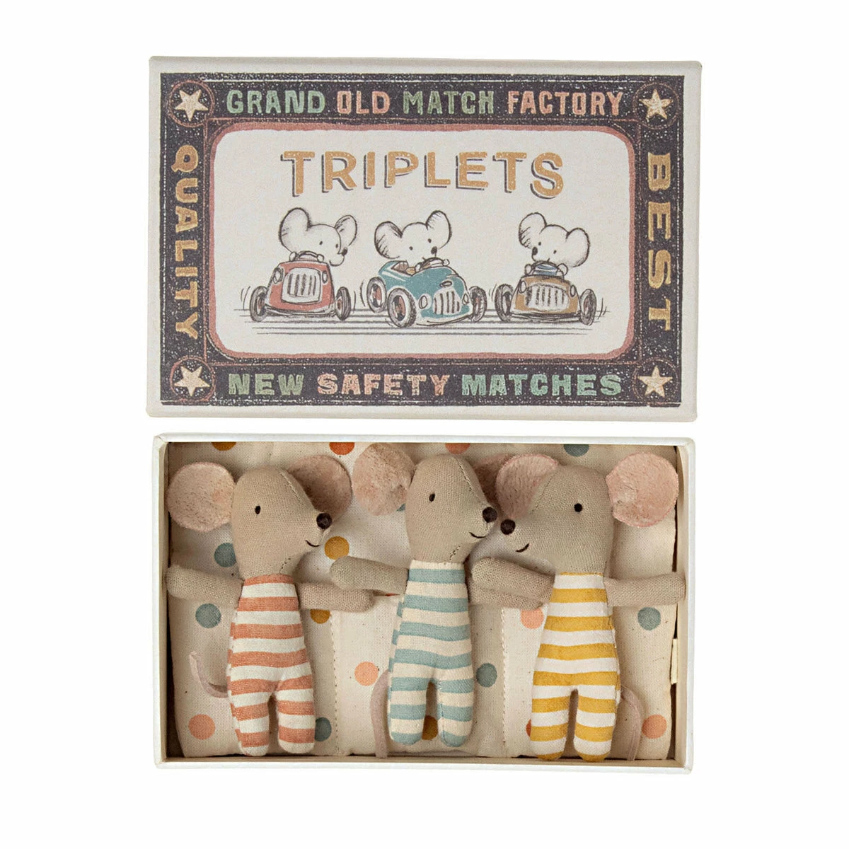 Now you can have 3 baby mice at the same time. The triplet baby mice are carefully tucked in their matchbox bed in a warm sleeping bag where they sleeps tight side by side.