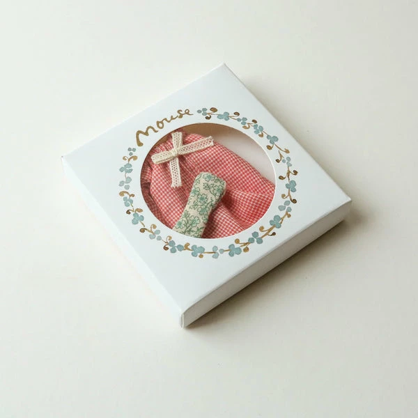 A soft nightgown and an eye mask that will keep the light out will ensure a good night’s sleep. This set fits mice size mum and dad perfectly. Maileg is a brand of charming Danish-designed toys created to inspire our children’s favourite playtime stories. By bringing storybook whimsy to everyday moments, Maileg toys help children explore the pure and simple wonder of imagination. Beloved for their heartwarming personalities, Maileg toys show playfulness and charm in every last detail. There is a timeless world filled with beautiful accessories and settings to be collected, cherished and shared with friends and family for generations. Size: Mother/Father mouse Height: 8 cm Recommended age: +3 Year Wash: 30°C Material: Cotton