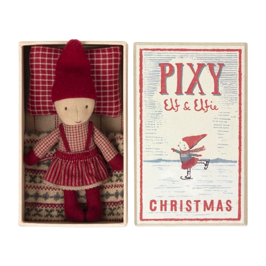 Designed by award-winning Danish brand Maileg, Pixy Efie has arrived in good time for the festive season and is a very welcome addition to this most charming family of Nordic characters. Beautifully crafted from cotton and linen, the vintage style Pixy comes in her own little matchbox with a cosy knitted blanket and tiny spotty pillow. Elfie is perfectly dressed for the winter in her warm red pinafore with matching red tights and hat. She is more than ready to have some fun, but just watch out, these Scandinavian pixies do tend to be a little naughty at times.