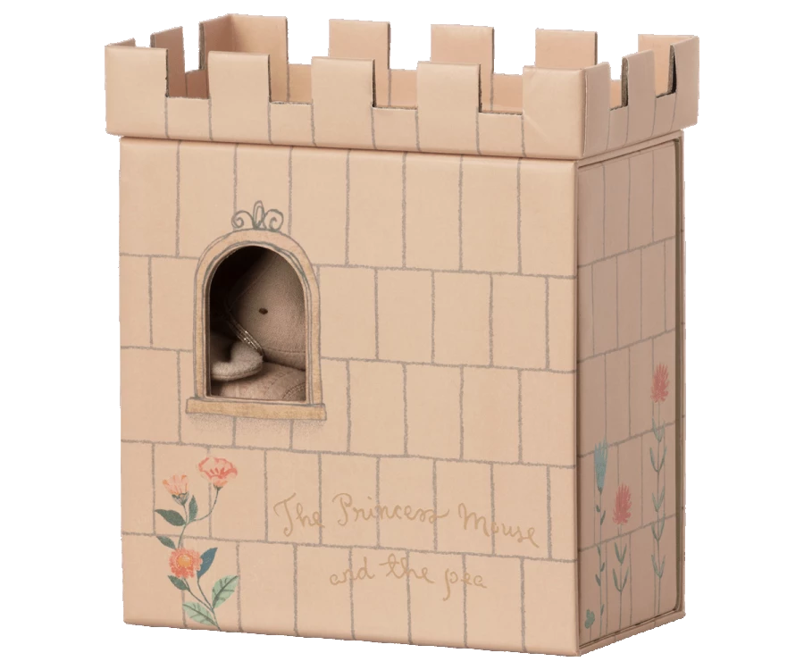 Once upon a time… Playset inspired by the famous fairy tale Princess and the pea. This set includes a paper castle with mattresses, a pea and a princess mouse. Product details Size : Big sister/brother Height: 17 cm Width: 15 cm Age: All ages Washing instruction: 30°C Material: Cotton Filling: Recycled polyester/Pe Pellets Maileg (pronounced My’lye) is a brand of charming Danish-designed toys created to inspire our children’s favourite playtime stories. By bringing storybook whimsy to everyday moments, Maileg toys help children explore the pure and simple wonder of imagination. Beloved for their heartwarming personalities, Maileg toys show playfulness and charm in every last detail. Theirs is a timeless world filled with beautiful accessories and settings to be collected, cherished and shared with friends and family for generations.
