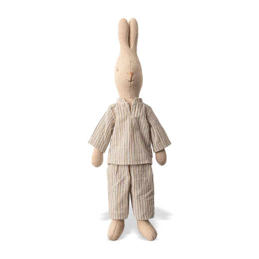 Ready for bed or just a quiet and relaxing day at home, this soft cotton and linen rabbit is dressed in the most stylish, comfortable pyjamas with fashionable stripes and a mandarin collar. This smaller-sized rabbit is irresistibly sweet and petite enough to pop in your bag or pocket making him a perfect companion for holidays or sleepovers.
