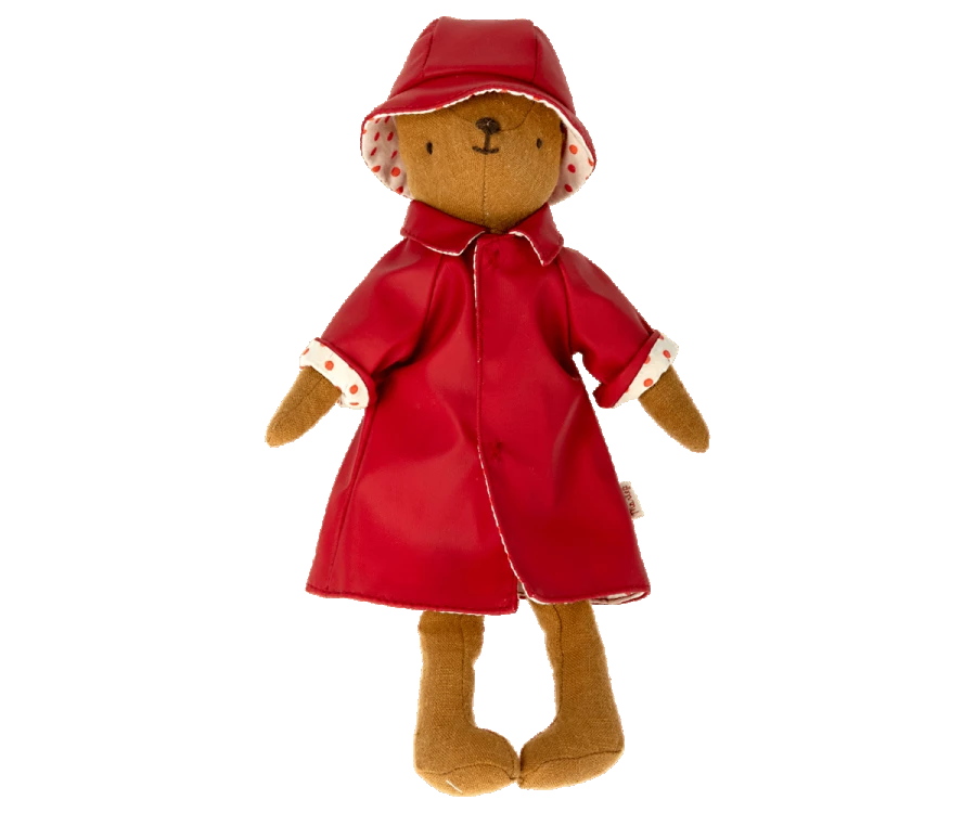 A beautiful set of rainwear that fits teddy mum. It will for sure keep her dry on rainy days. This set consists of a coat and a hat. Product details Size: Teddy Mum Height: 13 cm Width: 10 cm Age: 3 years + Washing instruction: 30°C Material: Polyester / Cotton Maileg (pronounced My’lye) is a brand of charming Danish-designed toys created to inspire our children’s favourite playtime stories. By bringing storybook whimsy to everyday moments, Maileg toys help children explore the pure and simple wonder of imagination. Beloved for their heartwarming personalities, Maileg toys show playfulness and charm in every last detail. Theirs is a timeless world filled with beautiful accessories and settings to be collected, cherished and shared with friends and family for generations.