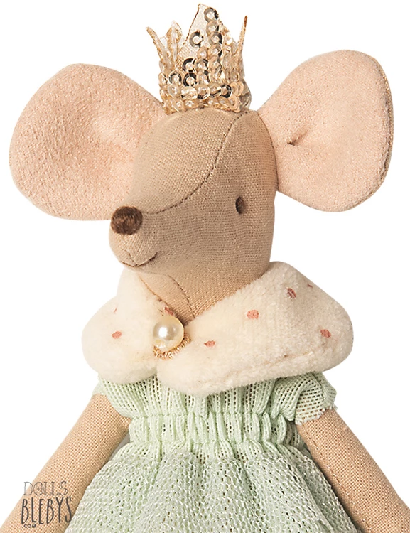 La reina mamá está lista para ir al baile con su vestido y su corona dorada tejida: su vestido es de tul verde claro con un cuello de piel típico de los reales atado con una preciosa perla y en la cabeza, entre las orejas, lleva una corona tejida con hilo dorado.