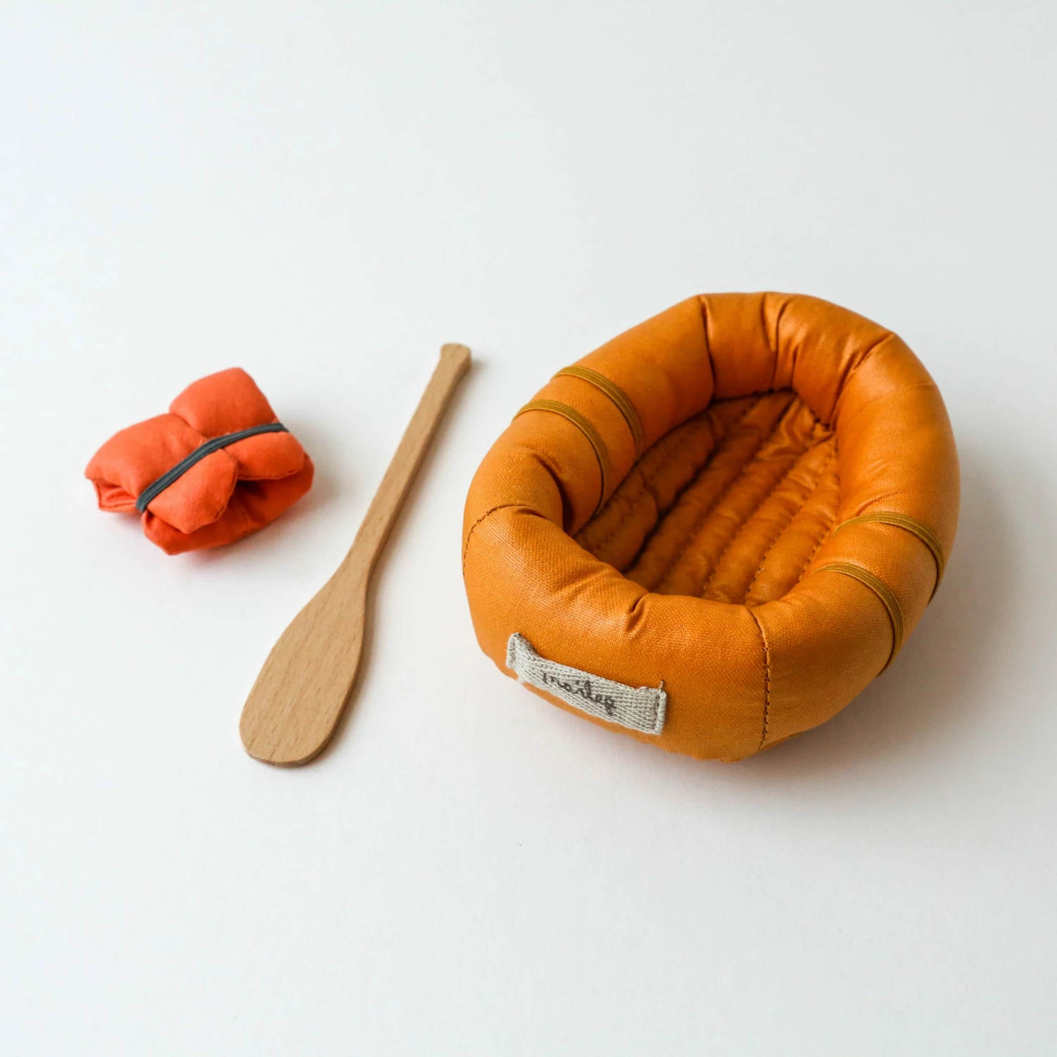 This little rubber boat is made of fabric and comes with life west and paddle as well. It is not water proof, so you have to imagine floating on the water. This set fits all mice sizes. Size: Mouse Height: 4 cm Width: 12 cm Age: 3 YR + Wash: Hand wash Material: Cotton / FSC Wood Filling: Recycled polyester