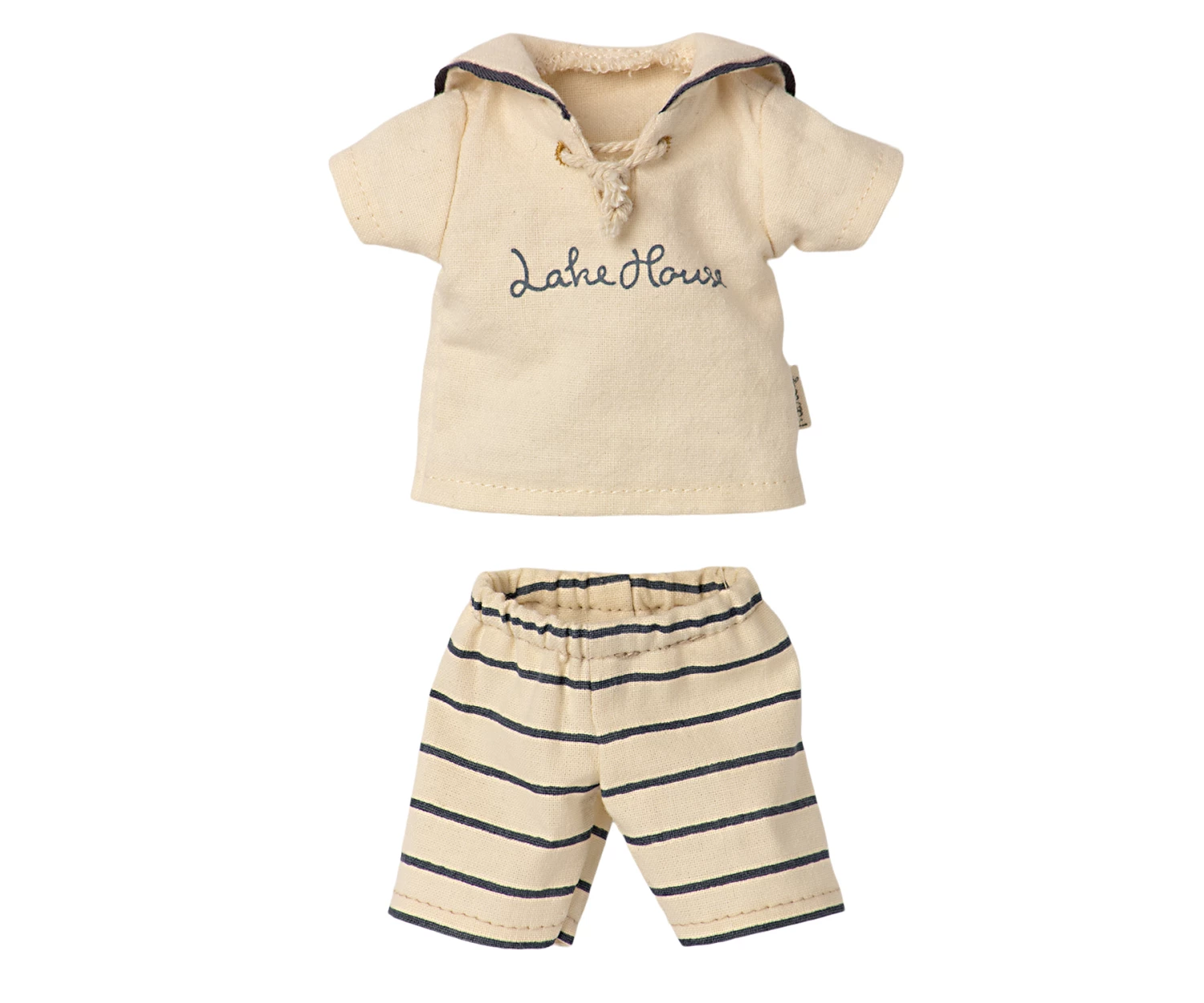 Beautifully crafted from 100% cotton and linen this super-smart Bunny is stylishly dressed for a day at sea with a crisp, traditional blue and cream sailor suit and matching striped shorts. Designed by award-winning Danish company Maileg, this delightful light brown rabbit with a pink nose and pointy ears has a timeless, nostalgic quality that makes Scandinavian toys so very desirable.