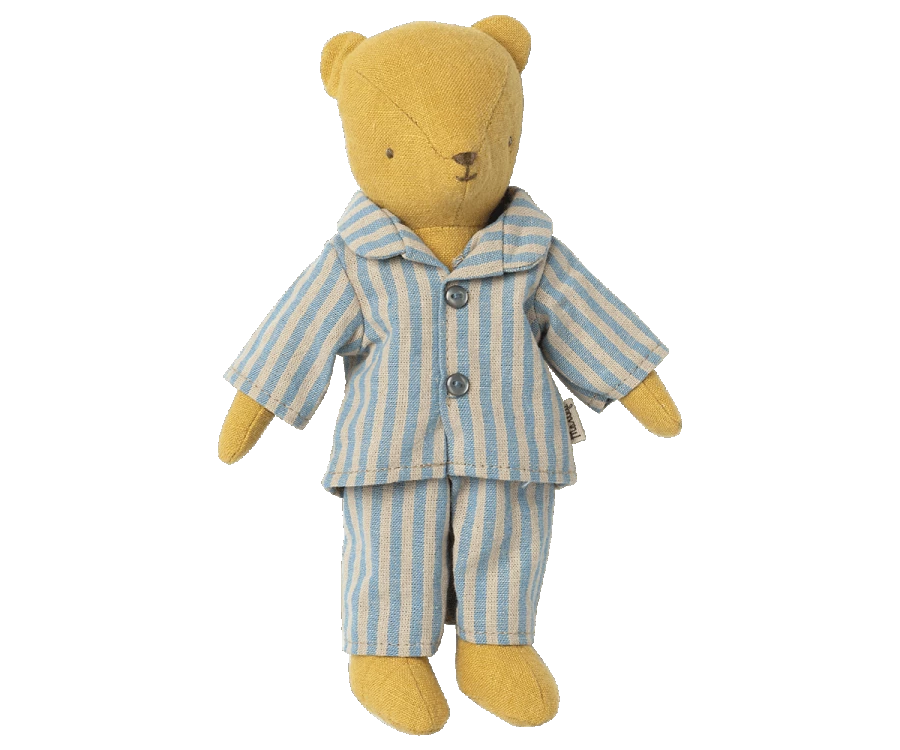 Zeit für den kleinen Teddy ins Bett zu gehen. Da darf natürlich der Schlafanzug nicht fehlen. Ein schönes Abendritual für Kleine wenn Kind und Teddy gemeinsam den Schlafanzug anziehen bevor sie in ihre Betten gehen. Dieses gibt es natürlich auch passend für den Teddy Junior und du kannst es ebenso wie den Teddy extra bestellen. Abmessung: 16 cm passend für Teddy Junior Material: Baumwolle Farbe: Hellblau Creme.