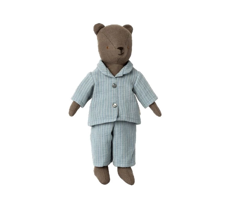 Auch für Papa Teddy ist es nach einem langen Arbeitstag Zeit ins Bett zu gehen. Da darf natürlich der Schlafanzug nicht fehlen. Ein schönes Abendritual für Kleine wenn Kind und Teddy gemeinsam den Schlafanzug anziehen bevor sie in ihre Betten gehen. Den Pyjama gibt es natürlich auch passend für den Teddy Junior und du kannst ihn ebenso wie den Teddy extra bestellen. Abmessung: ca. 21 cm passend für Teddy Papa Material: Baumwolle Farbe: Hellblau Creme Lieferung in einer kleinen Kartonverpackung ohne abgebildetes Zubehör.