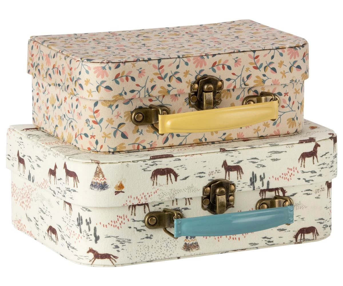 This is a 2 piece set. The suitases are covered with beautiful printed fabrics. Height : 3.15 in. Material: Paper/cotton/metal.