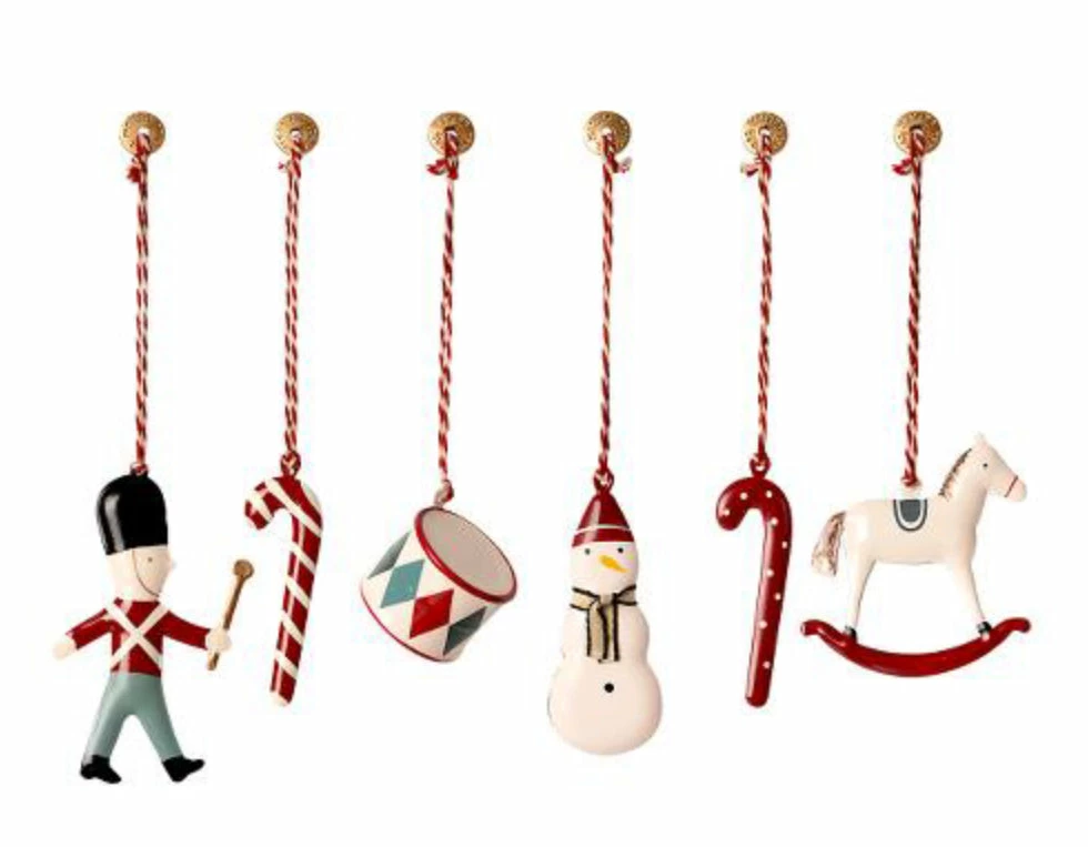 Gift box full of Christmas metal ornaments in classic red colors. Decorate your home and Christmas tree for the coming season. Size: Decoration Height 5cm Material: Painted Metal Care: Not suitable for children under the age of 3 years