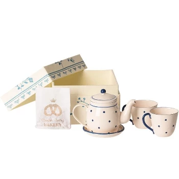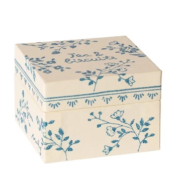This superb set contains everything you need for our little Maileg comforters to have a good time at tea time: 2 cups, 2 saucers, a teapot, a cookie dish and a bakery bag containing 6 small cookies.