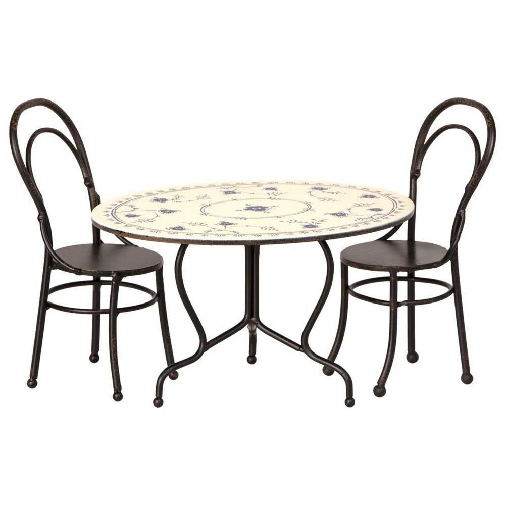Set Tavolo Bianco Fiorato e Sedie Micro Nere Dettagli: La confezione contiene un tavolo rotondo bianco fiorato e due sedie nere materiale: metallo colore: bianco fiorato e nero dimensioni: 8 cm tavolo topolini acquistabili a parte marca: Maileg