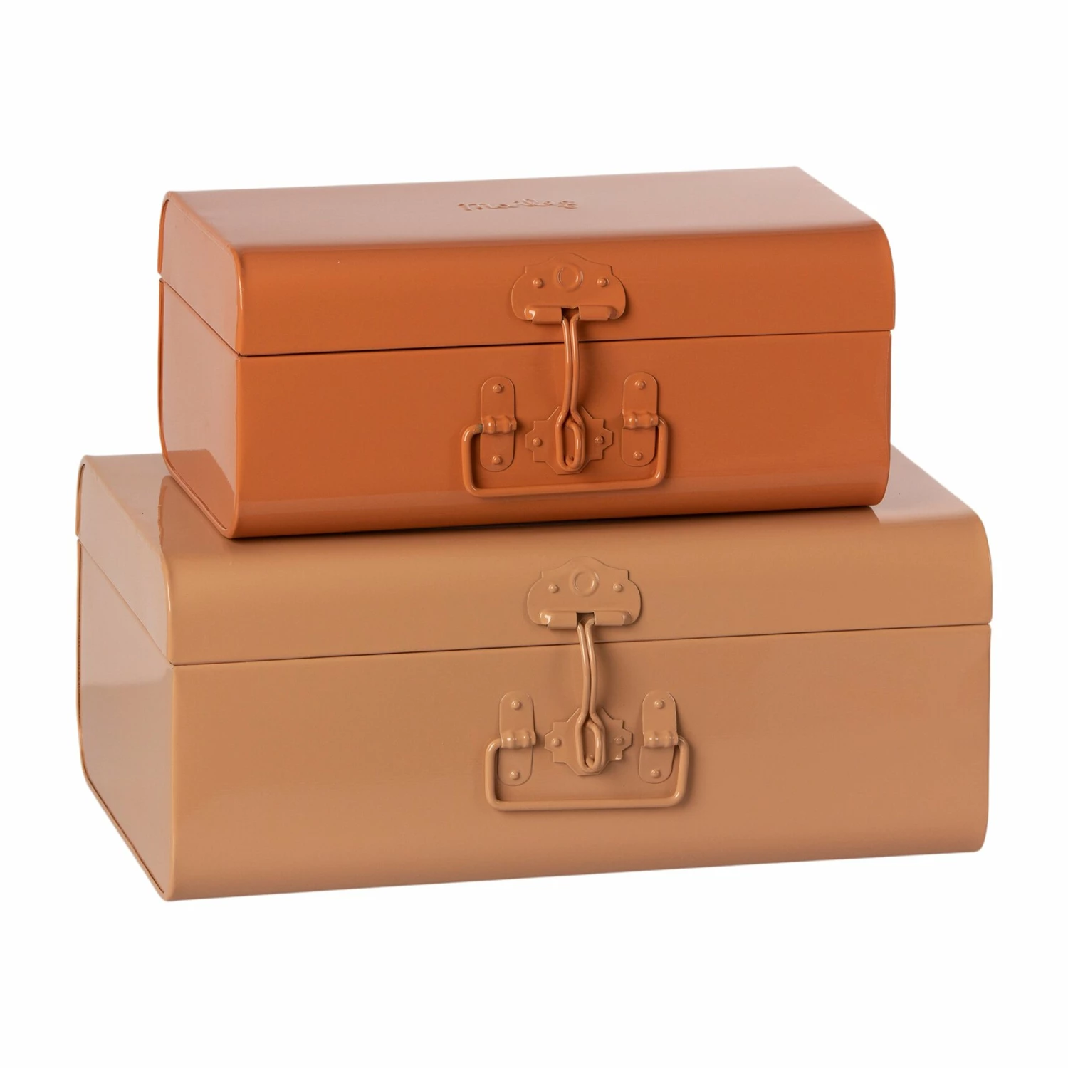 These suitcases are the perfect storage for anything you can imagine. This set consists of two suitcases. Size: Small 15x20x35 Large 18 x 44 x 27 Height: 18 cm Age: For decoration only Washing instruction: Surface wash Material: Metal