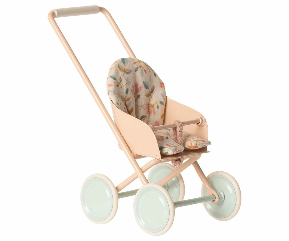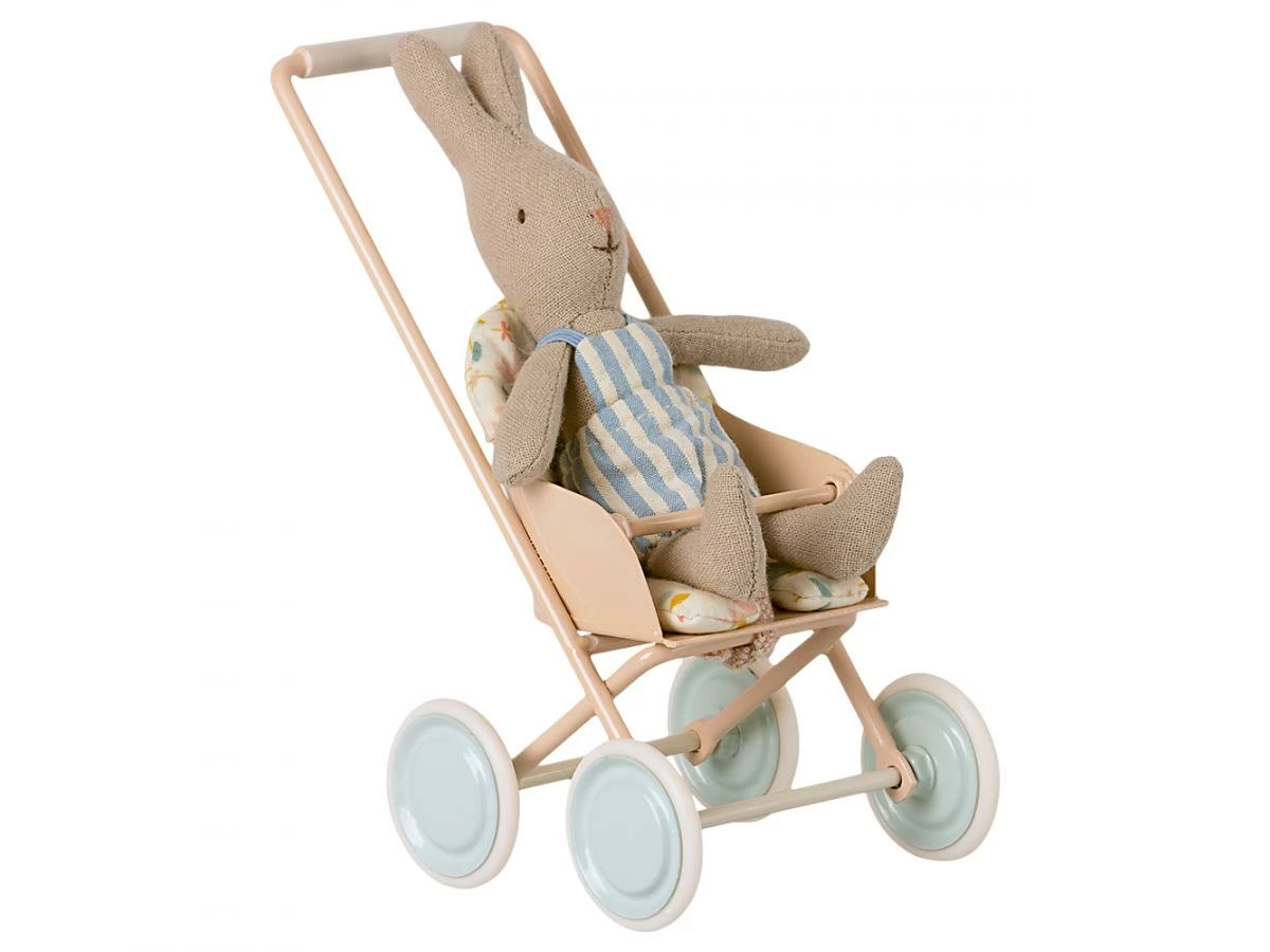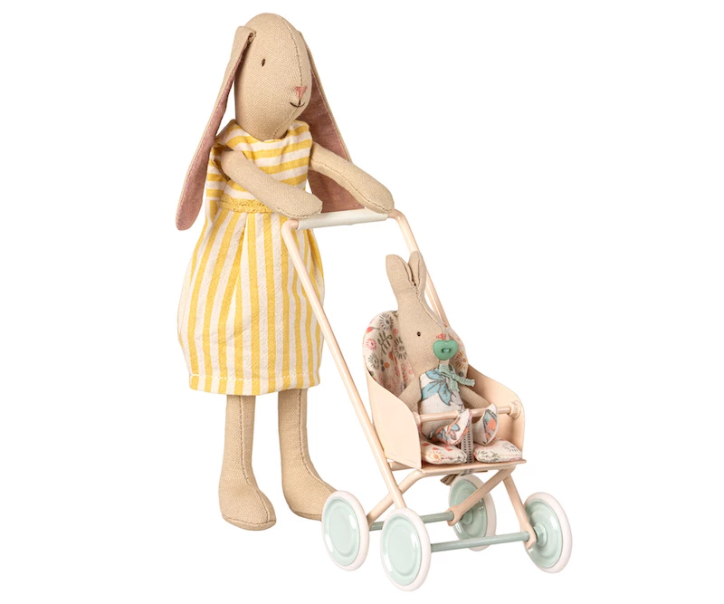This playfull stroller can be used for a lot of the Maileg friends, it is special made for the micro sized friends. The soft colors and design represent the vintage look and is a must-have for all miniature families with a baby.