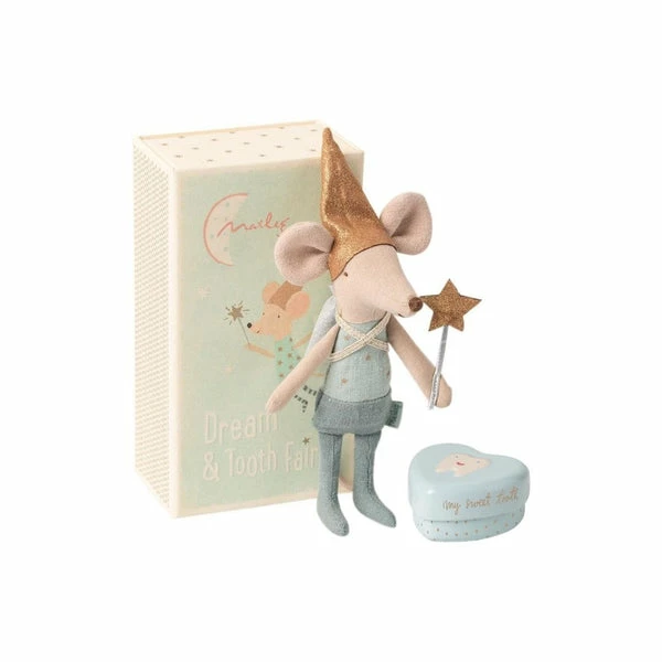 Maileg: Tooth Fairy – Big Brother Mouse With Metal Box. At night the tooth fairy spreads fairy dust, collects baby teeth, brings treats and always makes sure you have sweet dreams. Dressed magically in a blue starred top, stripped leggings, a shiny hat, and a sparkly backpack to store your tooth. Includes matchbox and a metal tooth box.Height : 12 cmAge: All agesWashing instruction: Hand WashMaterial: COTTON-POLYESTERSee the rest of the collection here.