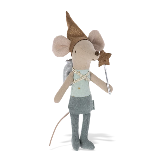Designed by award-winning Danish company Maileg, this little Tooth Fairy Mouse is a new variation on a popular design to join the Maileg family this season. Tooth Fairy Mouse is just waiting with his star-topped magic wand and shiny gold fairy hat to cast a spell over little ones while they sleep. Dressed in a shimmering silver back-pack and starry blue top, Blue Tooth Fairy looks just the part for the job. Just deposit a tooth in the tiny tin or pop it inside the back-pack and wait for the magic coin to appear overnight. When he is not guarding tiny teeth, the Mouse can rest in his beautifully designed matchbox bed.