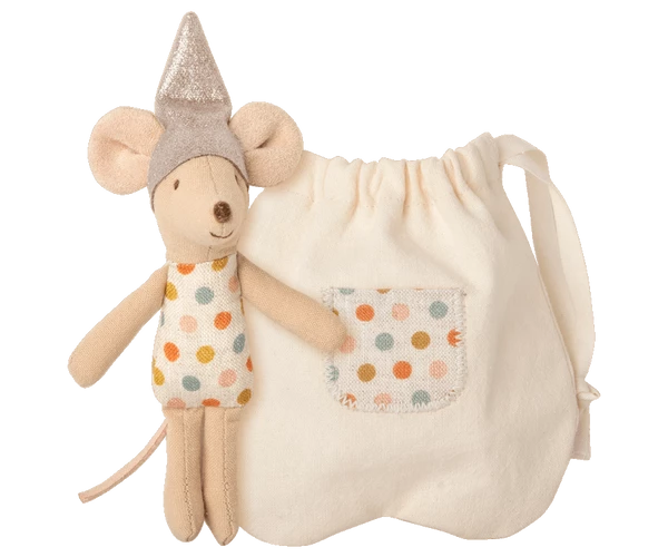 Founded in 1999, Maileg is a Danish toy brand founded by illustrator and designer Dorthe Mailil. Known for their imaginative, playful toy designs that range from mice in matchboxes, to giant bunnies, alongside all the accessories and clothing to dress up her creations. The designs skilfully blend the Scandinavian aesthetic with the tradition of animal soft toys, making Maileg so popular amongst children and their parents. At night the tooth fairy spreads fairy dust, collects teeth, brings treats and makes sure you have sweet dreams. The mouse comes with a little bag. Item No.: 16-0720-00 Size: Little sister/brother Height: 10 cm Age: All ages Wash: 30°C Material: Cotton/Linen Filling: Polyester/Pe Pellets