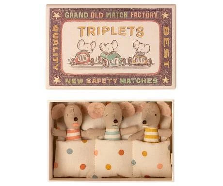 Size of Mice: 8cm Material: Cotton Washing Instruction: 30 degrees Now you can have 3 baby Maileg mice at the same time. The triplet baby mice are carefully tucked up in their matchbox bed in their warm, spotty sleeping bag. They all have their own passifier and sleep tight side by side.