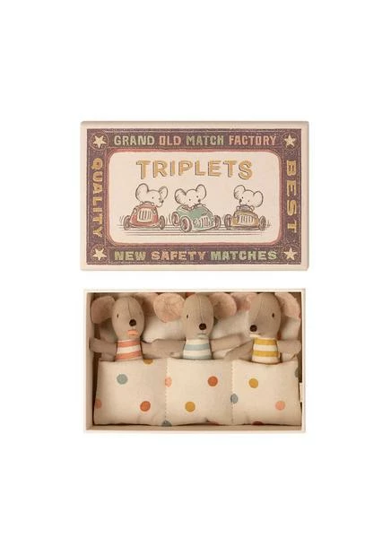 Now you can have 3 baby mice at the same time. The triplet baby mice are carefully tugged in their matchbox bed in a warm sleeping bag. They all have their own passifier and sleeps tight side by side. Size : Baby mouse Height : 8 cm Age: All ages Washing instruction: 30 degrees Material: Cotton