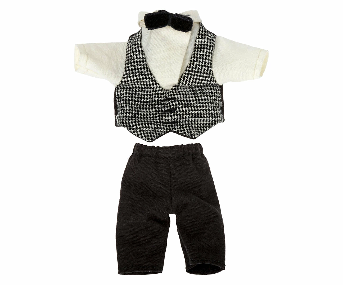 A classic set of clothes for a waiter including a shirt with vest, a bow and a pair of pants. This set fits all mice in size of big brother and sister perfectly. Part of the Maileg Royal Collection. Height 9cm, Maileg Big Sister/Brother Size. Suitable for ages 3Yrs+ Maileg Royal Collection