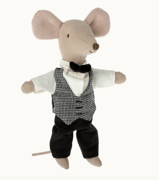 A classic set of clothes for a waiter including a shirt with vest, a bow and a pair of pants. This set fits all mice in size of big brother and sister perfectly.