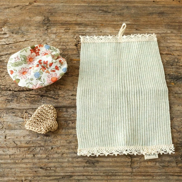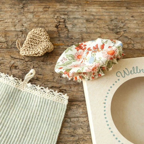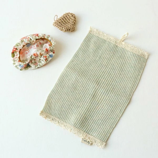 The wellness set comes with a towel, a bathing hat and a bath mitten. The hat and glove fits the Maileg bunnies size 1 & 2 and Teddy family. Fits: Bunny size 1 & 2 9cm x 9cm Age: 3+ years Wash: 30°C Material: Cotton/Polyester