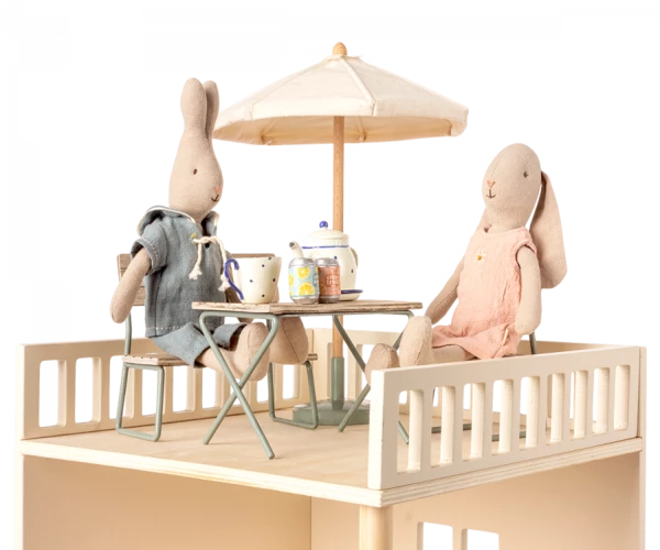 Dont forget the outdoor room – this garden set is perfect for all the summer get-togethers. It is made in a vintage look and fits all bunnies and rabbits in size 1 and 2 as well as the Teddy family. The base is made in metal and the top is in wood Size: Mini Table: H: 9 cm / L: 12 cm / W: 8 cm Chair: H: 12 cm / L: 5.5 cm / W: 6.5 cm Benche: H: 12 cm / L: 12 cm / W: 6.5 cm Wash: Surface Wash Material: FSC Wood / Metal